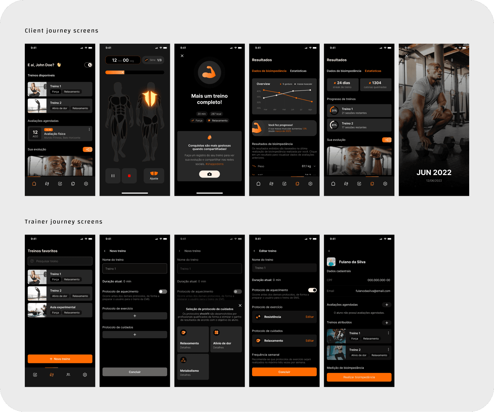 The shockfit device does not have a display, which sparked the need for a mobile app capable of operating and setting up the device for both the user and the trainer.